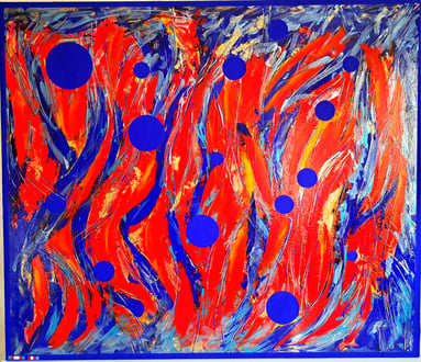In den ausgestellten Gemälden habe ich das Thema Flammen bearbeitet als Sinnbild für das "Brennen auf der Erde" (bzw. auf den Kontinenten & in den Ozeanen) ausgelöst durch Umweltzerstörung, Kriege und Epidemien/ Pandemien. Ich habe versucht, wieder eine Harmonie mit den Mitteln der Kunst herzustellen. Die unruhigen komplementär und kräftigen Farben werden durch die matt schwarzen und weißen schwebenden Kreise, sowie durch den glänzenden und matten Firnis "besänftigt".